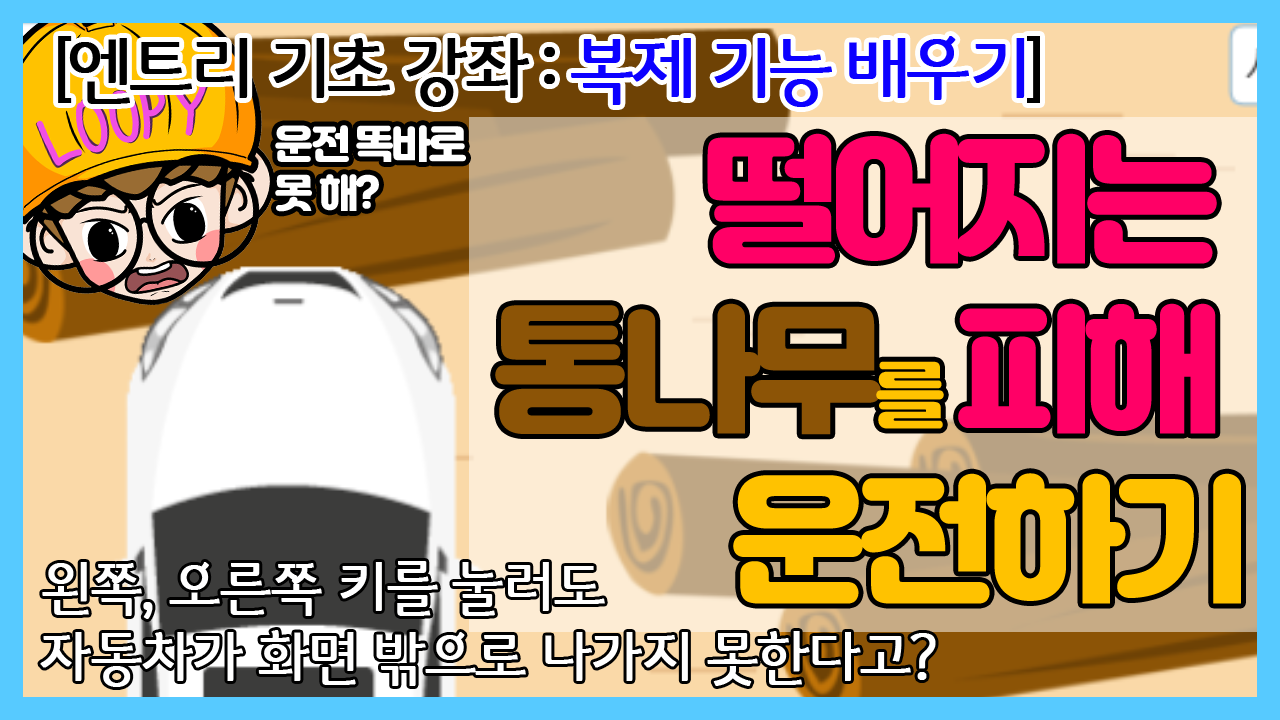 [엔트리 기초 강좌]내려오는 통나무를 피하면서 먼거리까지 운전하기, 엔트리 교육, entry tutorial,x좌표,y좌표 이동하기,얼렁뚱땅 코딩 조립소,코딩 강좌